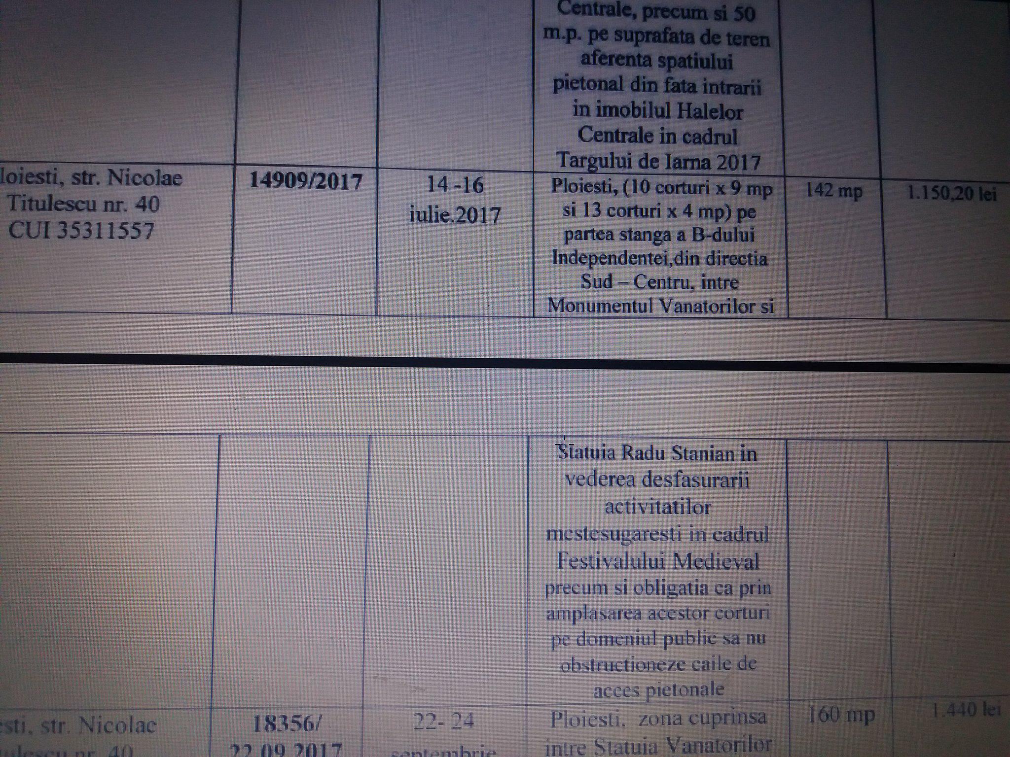 In zona Festivalurilor a existat o singura firma tampon – ANTICAFE NEW EXPERIENCE SRL – care a avut exclusivitate la spatiile comerciale inchiriate pe preturi modice – si care le-a subinchiriat pe bani inzeciti ! In rest, doar chirii SGU si HALE ! Nu s-a incasat nimic de la Festivalul Medieval sau de la Zilele Ploiestiului.