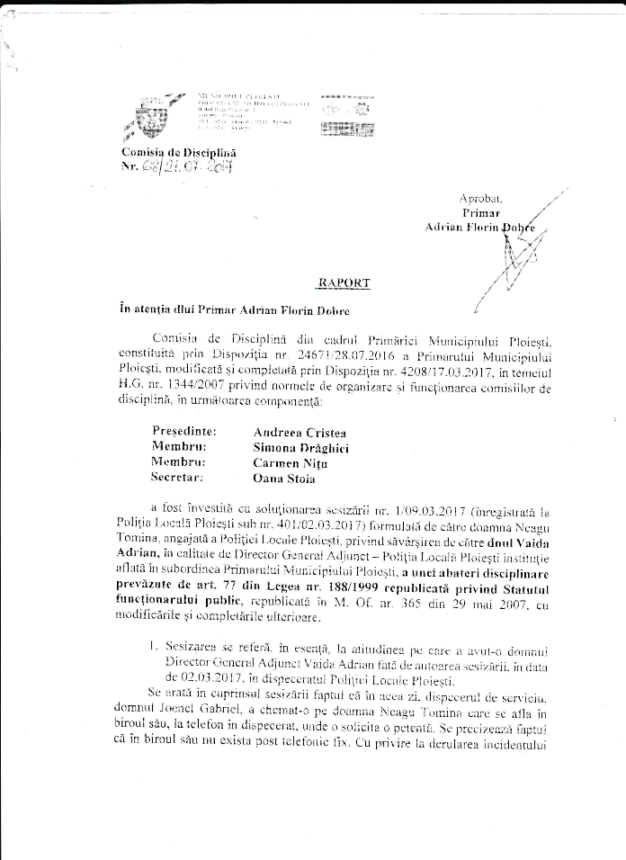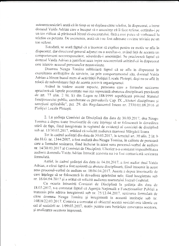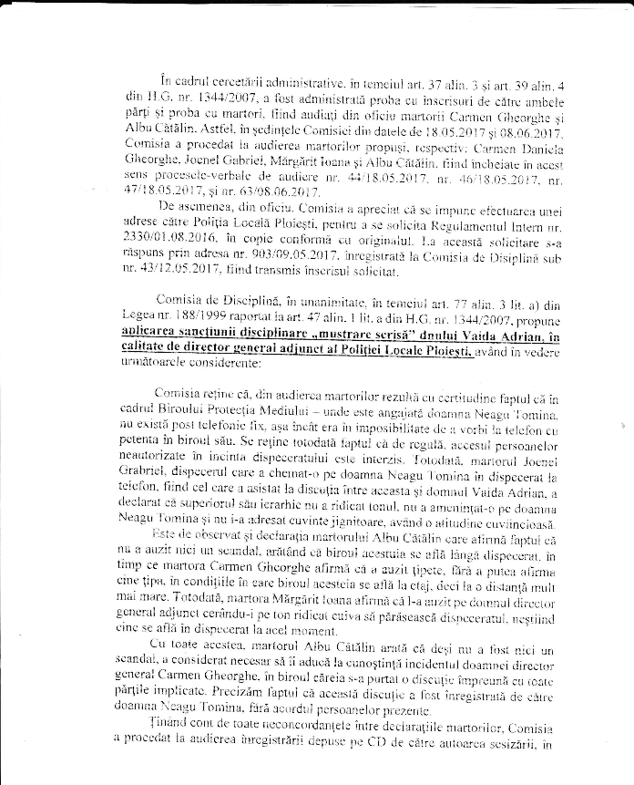 Astfel, in Raportul Comisiei de Disciplina nr 68 din 21.07.2017 se specifica in mod clar faptul ca, “ in UNANIMITATE, Comisia apreciaza ca, fapta care formeaza obiectul sesizarii nr. 1/09.03.2017 reprezinta ABATERE DISCIPLINARA prevazuta de art. 77 alin. 2 lit k) din Legea nr 188/1999 republicata privind Statutul functionarului public si propune in temeiul art. 77 alin 3 lit c) din Legea nr 188/199 raportat la art. 47 alin.1 lit. a din H.G. nr. 1344/2007, aplicarea sanctiunii disciplinare “mustrare scrisa” dnului VAIDA ADRIAN, in calitate de director general adjunct al Politiei Locale Ploiesti”.