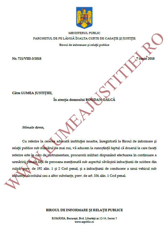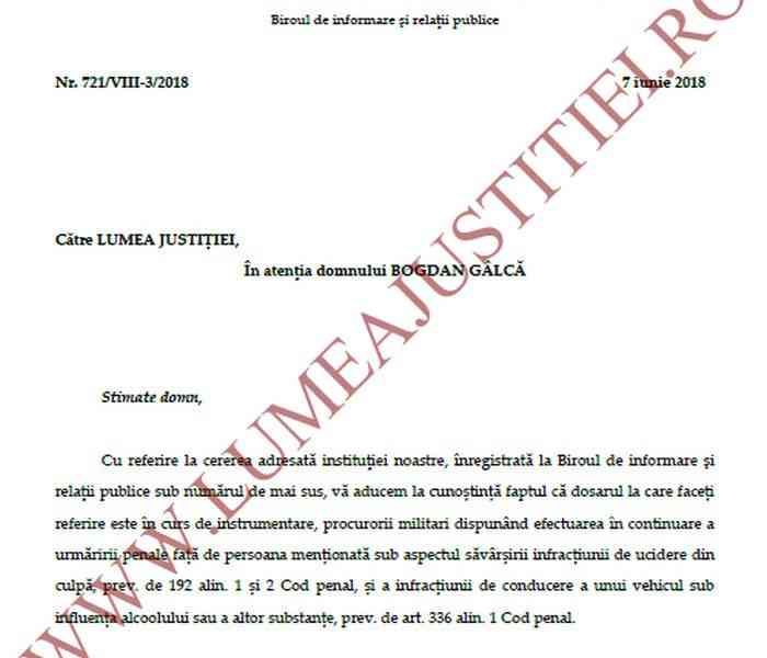 Dosarul este in curs de instrumentare, procurorii militari dispunand efectuarea in continuare a urmaririi penale fata de persoana mentionata sub aspectul savarsirii infractiunii de ucidere din culpa, prev. de 192 alin. 1 si 2 Cod penal, si a infractiunii de conducere a unui vehicul sub influenta alcoolului sau a altor substante, prev. de art. 336 alin. 1 Cod penal”.