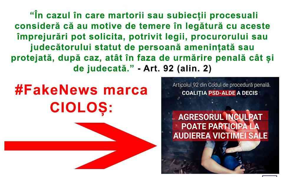 Făcând referire la modificarea articolului 92, alin. 2 din Codul de procedură penală, distinsul Cioloș vrea să genereze #EMOȚIE și scrie așa pe Facebook: „Agresorul inculpat poate participa la audierea victimei sale”. #FALS! În realitate, în alineatul modificat mai apare și următorul text, pe care Cioloș se face că nu îl vede inducându-și publicul în eroare: „În cazul în care martorii sau subiecții procesuali consideră că au motive de temere în legătură cu aceste împrejurări pot solicita, potrivit legii, procurorului sau judecătorului statut de persoană amenințată sau protejată, după caz, atât în faza de urmărire penală cât și de judecată”.