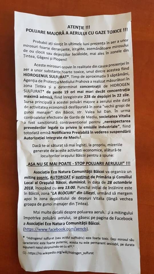 Redacția Incisiv de Prahova a solicitat public Parchetului de pe Lângă Tribunalul Prahova (și își menține această solicitare publică) să deschidă un dosar penal împotriva falșilor ecologiști/„apărători ai mediului” (Primăria Băicoi, Primarul și Președintele Consiliului Local Băicoi) care încearcă cu disperare să distragă atenția de la faptul că ei și OMV Petrom distrug mediul înconjurător și îmbolnăvesc oamenii dar aruncă vina pe altcineva: societatea Vitalia.