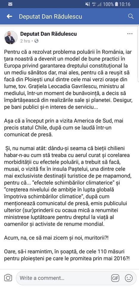 În cazul „poluării cu gunoi de la Băicoi” atât de mult trâmbițată de falșii ecologiști, indivizi politizați și „petrolizați” până în măduva oaselor care, mai nou, s-au gândit ei să facă miting „ecologic” în data de 28 octombrie 2018… o recunoaște chiar deputatul USR de Ploiești, Rădulescu Dan în postarea sa de pe FaceBook în care susține că „va aprticipa la mitingul împotriva poluării Orașului Băicoi”. „Ecologiștii” din Băicoi sunt în fibrilații pentru pregătirea mitingului politic din 28 octombrie 2018… doar USR-ul „nu-i înghite” pe cei de la PSD-ALDE… căci din ALDE face parte primarul Orașului Băicoi care „tot uită” de vechea groapă de gunoi și nu îi bagă în seamă pe falșii ecologiști care „guiță” în spațiul public că „activitatea petrolieră nu poluează ci doar Depozitul de deșeuri al societății Vitalia poluează”. Sau îi protejează chiar Primarul Băicoiului pe acești falși ecologiști? Cel puțin, falșii ecologiști din Orașul Băicoi susțin în manifestele lor că „Primăria și Consiliul Local îi susțin” (cu ce bani or fi printat manifestele? Cumva cu cei ai petroliștilor ? Sau ai primăriei? Sau ai USR-Prahova? Ori cu banii PSD-ALDE?).