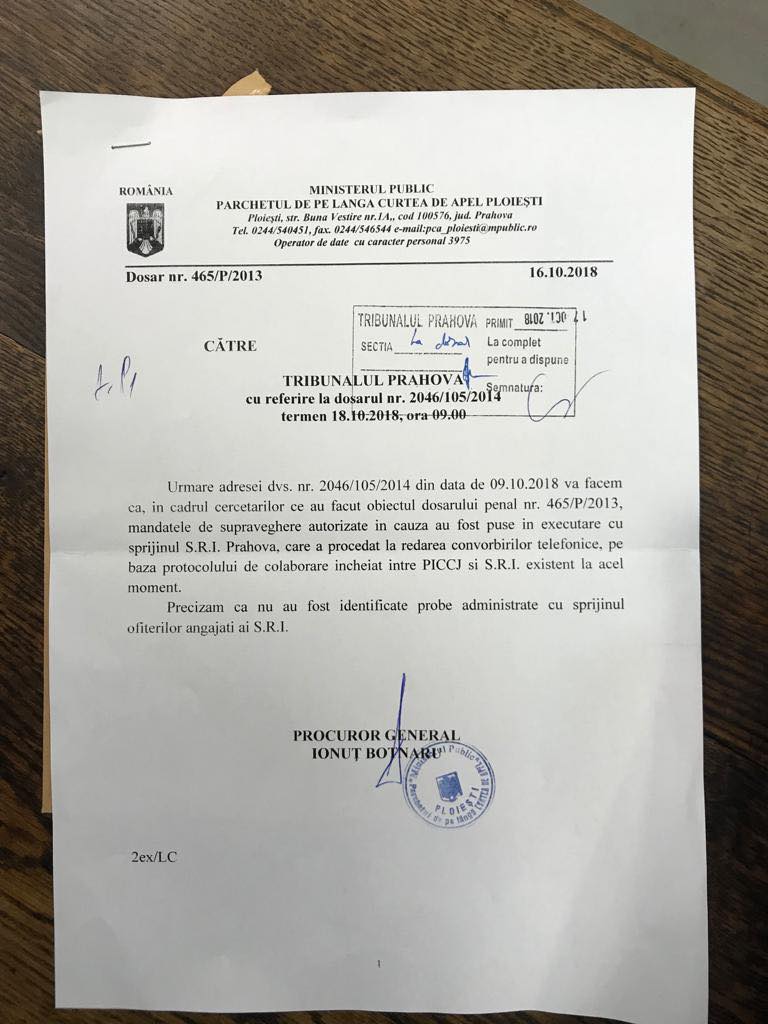 O adresa emisă sub semnătură Procuror General Ionuț Bodnaru frizează nu numai logica dar si bunul simt. Acesta reușește performanta greu de egalat ca intr-o adresa de câteva rânduri sa se contrazică flagrant. Astfel după ce raspunde întrebărilor Tribunalului Prahova admitand aplicarea protocolului cu SRI si ICCJ si faptul ca mandatele de interceptare au fost puse în executare cu sprijinul SRI, ofițerii SRI redand convorbirile telefonice, același procuror neagă existența unor probe administrate cu sprijinul SRI.