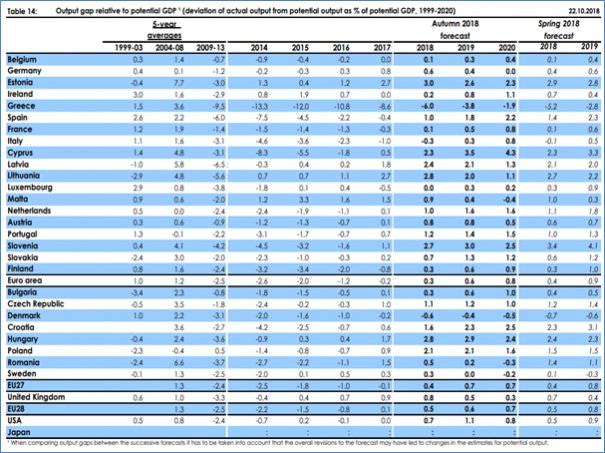 Legat de investiţii şi creşterea economică efectivă dar şi mai mult, de sustenabilitatea creşterii economice, vedem în prognoza de toamnă a CE că nu a existat şi nu va exista risc de supraîncălzire în economia românească, output gap-ul (decalajul dintre producţia efectivă şi cea potenţială), fiind estimat pentru 2018 la 0,5% din PIB potenţial – înseamnă condiţii normale. Doar Italia şi Grecia produc sub potenţial în anul 2018. Interesant, guvernarea din perioada 2017-2018 poate spune că prin implementarea strategiilor de dezvoltare a scos economia românească din decalajul recesionist aferent anului 2016 (output gap de minus 1,1% din PIB potenţial) şi a condus-o spre decalajul expansionist aferent anului 2017 (output gap pozitiv de 1,5% din PIB potenţial) şi în 2018 de 0,5% din PIB potenţial.