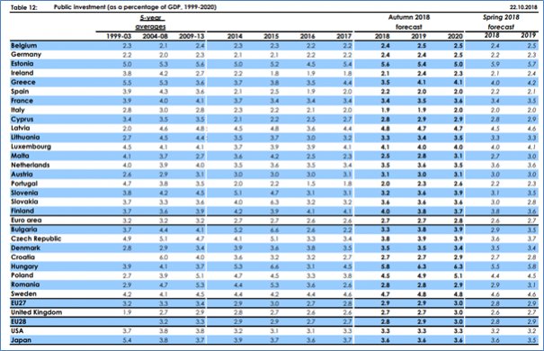 Vorbind despre nevoia impulsionării puternice a investiţiilor în economie în 2019 şi 2020 vedem că România va avea investiţii publice de 2,8% din PIB, la nivelul mediei UE28 (locul 18 în UE28). Mai mult, la investiţiile totale în economie, experţii Comisiei Europene prognozează pentru anul 2018 o pondere de 4,6% din PIB, locul 13 între ţările UE28.