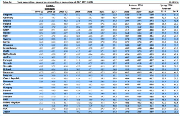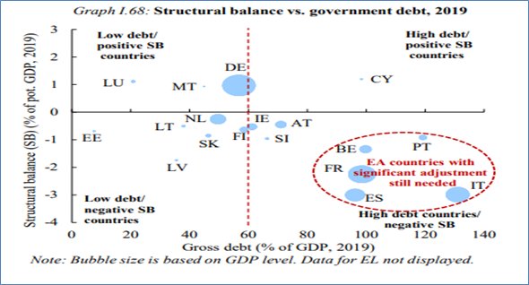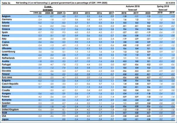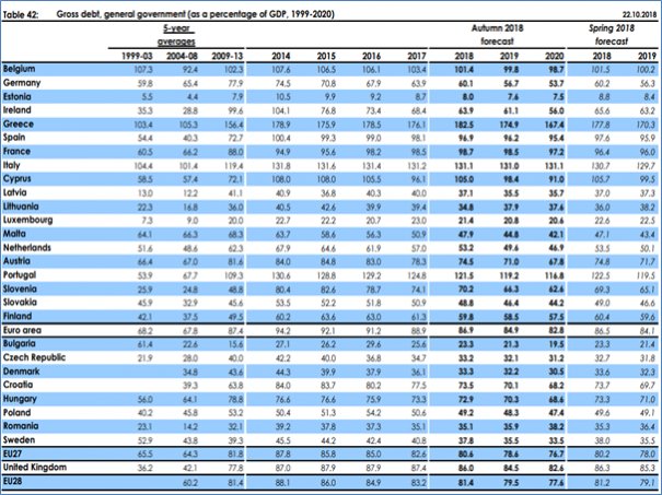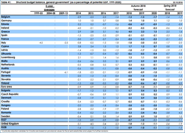 Tot în Prognoza de toamnă a Comisiei Europene putem observa care sunt ţările din Zona Euro cu o situaţie nesănătoasă a finanţelor publice, vorbim aici de o asociere ponderi mari ale datoriei guvernamentale în PIB – deficite bugetare structurale ridicate. Sunt cinci ţări cu probleme delicate în 2019: Italia cu un deficit bugetar structural estimat de 3% din PIB potenţial concomitent cu o datorie guvernamentală de 131% din PIB (a doua cea mai mare din UE), Spania, deficit bugetar structural de 3,1% cu datorie de 96,2% din PIB, Franţa cu o estimare de deficit bugetar structural de 2,3% din PIB potenţial suprapus unei datorii de 98,5% din PIB, Belgia deficit bugetar structural de 1,3% din PIB potenţial şi datorie de 99,8% din PIB precum şi Portugalia cu un deficit bugetar structural prognozat la 0,9% din PIB potenţial şi o datorie guvernamentală de 119,2% din PIB.