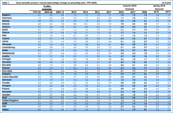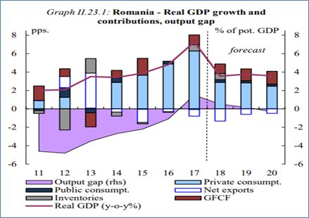 Cât priveşte creşterea economică a României, experţii Comisiei Europene estimează 3,6% pentru anul 2018, sub estimarea CNSP de 4,5%. Având în vedere că România a avut în trimestrul trei din acest an cea mai mare creştere economică din UE şi că anualizat ea se ridică la 4,2% consider plauzibilă prognoza de creştere economică a CNSP.