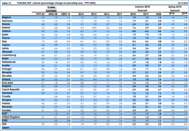 Când vorbim de sustenabilitatea creşterii economice ne referim la comparaţia cu rata de creştere a PIB potenţial care în cazul României se prognozează a fi în 2018 de 4,6% (cu 0,3 puncte procentuale peste prognoza CE din primăvară) şi în creştere consistentă faţă de 2016 când era de 3,6% (detalii în tabelul de mai jos). Ca şi în 2017 şi în 2018 România se află pe locul 3 în UE28 la creşterea PIB potenţial, în 2019 şi 2020 urmând a urca pe un binemeritat loc 2. Creşterea PIB potenţial nu înseamnă decât o creştere calitativă, intensivă, convergenţă sustenabilă, modernizare. Acesta este încă un argument pentru succesul implementării agresive a strategiilor #wageledgrowth şi#newdevelopmentalism în România în perioada 2017-2018 şi gradual în perioada 2019-2020 (când se face transferul către #bigpushinvestiţional).