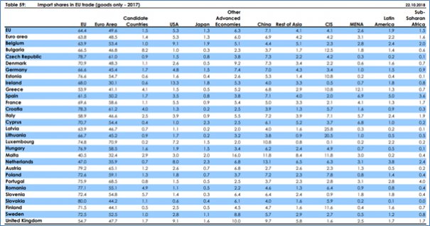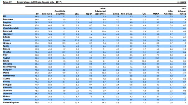 Nu în ultimul rând ca importanţă vis-a-vis de discuţia privind soliditatea apartenenţei la valorile integrării europene trebuie să avem în vedere un fenomen puţin observat. România este una dintre cele mai integrate/ deschise economic / comercial către ţările UE, având o pondere a exporturilor de bunuri către UE în total de 72,3% (locul 11 în UE) şi o pondere a importurilor de bunuri din UE în total de 77,1% (locul 5 în UE).