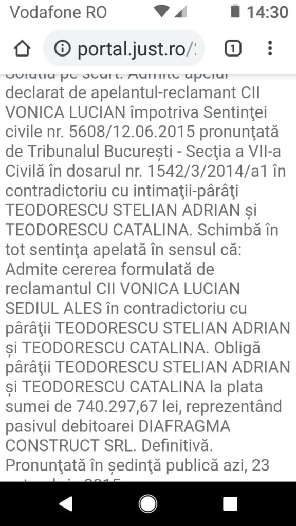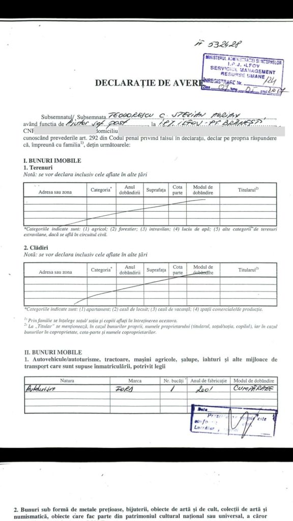 ASP Teodorescu Stelian Adrian, șeful de post al Postului de Poliție Branesti din cadrul IPJ Ilfov si-a completat declaratia de avere, anuală, conform legilor in vigoare, numai că…..”a uitat „probabil sa-si declare datoriile. Asa cum se poate observa din aceste declarații completate și semnate de catre acesta, domnul în cauză nu deține nimic, decât un autoturism ( desi locuiește într-o vilă, care ce sa vezi …”nu-i apartine”)…Cu toate că si-a construit casa prin firma sotiei sale ….SC TEODORESCU CONSTRUCT SRL…..în urmă cu 8-9 ani. La data de 23. 10. 2015 a fost emisă o hotărâre a Curții de Apel București prin care îi obligă pe cei doi soți la plata sumei 740287,67 lei reprezentând pasivul debitoarei „DIAFRAGMA CONSTRUCT „SRL,datorie ce nu se regăsește în declarația de avere a renumitului asa cum prevede legea.