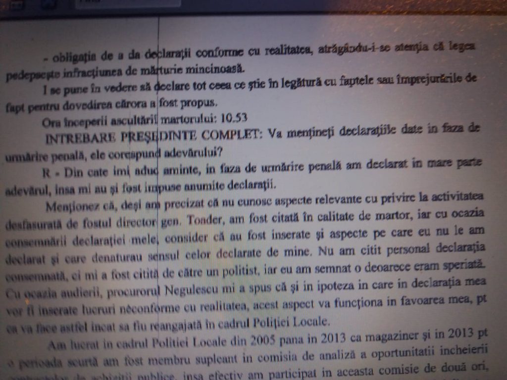 Raspuns martor Stegaru Ionela:…”Mentionez ca, desi am precizat ca nu cunosc aspect relevante cu privire la activitatea desfasurata de fostul director general Toader, am fost citata in calitate de martor, iar cu ocazia consemnarii declaratiei mele, consider ca au fost inserate si aspect pe care eu nu le-am declarat si care denaturau sensul celor declarate de mine. Nu am citit personal declaratia consemnata, ci mi-a fost citita de catre un politest, iar eu am semnat deoarece eram speriata. Cu ocazia audierii, procurorul Negulescu mi-a spus ca si in ipoteza in care in declaratia mea vor fi inserate lucruri neconforme cu realitatea, acest aspect va functiona in favoarea mea, pentru ca va face astfel incat sa fiu reangajata in cadrul Politiei Locale …”