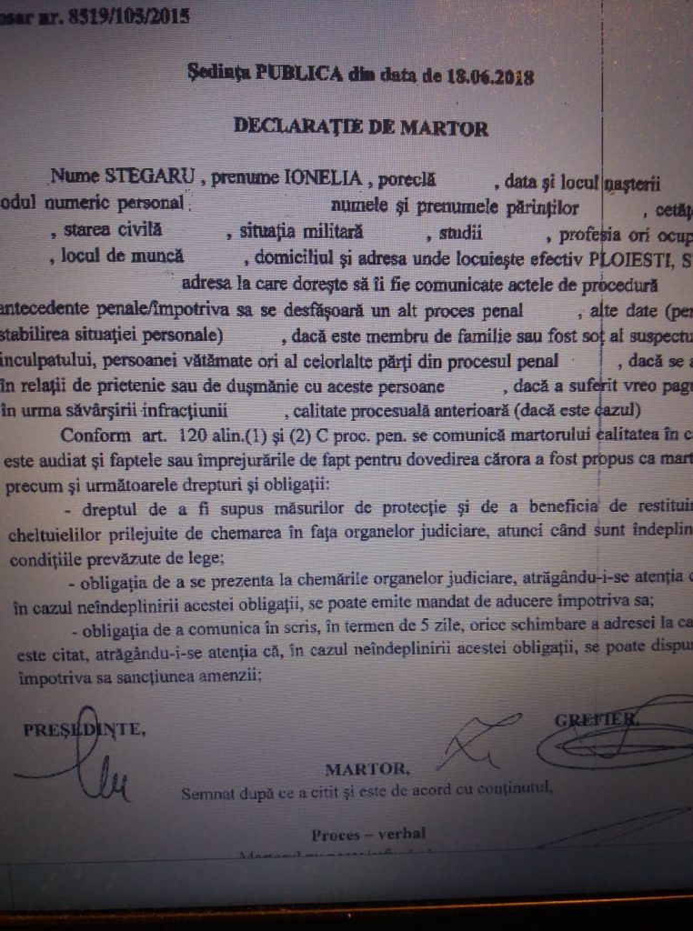 I. In dosarul nr 8519/105/2015 de pe rolul Tribunalului Prahova incep sa se obtina date care confirma in totalitate dezvaluirile noastre privind implicarea procurorului Negulescu Mircea si al directorului general al Politiei Locale Ploiesti, Carmen Gheorghe, in fabricarea de probe si influentarea martorilor (prin presiuni) in scopul inlaturarii si condamnarii fostului director al acestei institutii, Toader Cristinel.