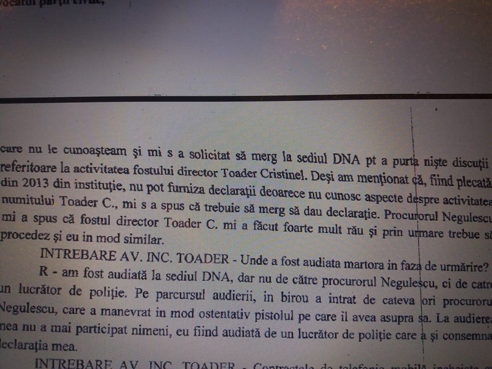 Raspuns martor Stegaru Ionela: – Am fost apalata telephonic de directorul de la aceea vreme a Politiei Locale si chemata in biroul acesteia, unde se mai aflau 2-3 persoane pe care nu le cunosteam si mi s-a solicitat sa merg la sediul DNA pentru a purta niste discutii referitoare la actrivitatea fostului director Toader Cristinel. Desi am mentionat ca, fiind plecata din 2013 din institutie, nu pot furniza declaratii deoarece nu cunosc aspect despre activitatea numitului Toader C., mi s-a spus ca trebuie sa merg sa dau declaratie. Procurorul Negulescu Mirceami-a spus ca fostul director mi-a facut mult rau si prin urmare trebuie sa procedez si eu in mod similar.