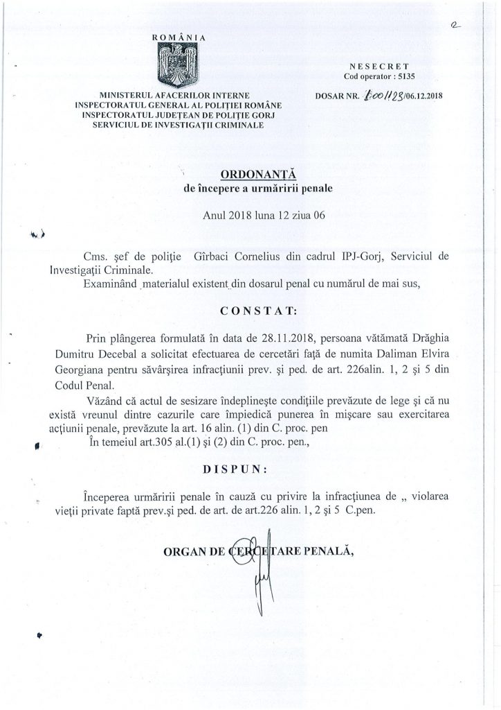 Draghiea Decebal Dumitru-inspectorul sef al IPJ Gorj –fiul prefectului de Mehedinti Nicolae Draghiea si de asemenea fiul vitreg al Anei Draghiea, actuala sotie a prefectului, presedinta a Autoritatii Electorale Permanenete Mehedinti -a incercat sa ma intimideze ( printre alte amenintari, presiuni,persecutari si terorizari) prin formularea unor plangeri penale in dauna subsemnatei . Astazi am decis sa va impartasesc obiectul primei plangeri penale formulate de inspectorul sef Draghiea Decebal Dumitru , si anume ,,violarea vietii private„ conf.prev.art 226 CP. Consider imperios necesar sa mentionez si cadrul abuziv in care s-a desfasurat ancheta, solutionata ulterior, dupa luni de dezbateri si ,,cercetari de amploare„ ale ATENTIE !!!-SUBALTERNILOR INSPECTORULUI SEF DRAGHIEA DECEBAL DUMITRU!!! Da! Da! Ati citit bine! Inspectorul sef Draghiea Decebal Dumitru a considerat necesar sa se planga, subalternilor sai , ca subsemnata, amanta lui , femeia care ia purtat in pantece rodul pasiunii –o fiinta inocenta sacrificata de dragul imaginii si a functiei , a ,,indraznit” sa ii ,, violeze viata private” deoarece am cerut ajutorul mass-mediei pentru a ma proteja de acesta si de politistii subordonati ce ma terorizau, chiar daca subsemnata eram bolnava, in pragul septicemiei datorita complicatiilor medicale survenite in urma avortului medicamentos la care am recurs fiind constransa si amenintata de inspectorul sef Draghiea Decebal Dumitru! Asa ca dis-de-dimineata, am fost citata ca ,,martor” in dosarul cu pricina, desii sufeream o grava infectie, stari febrile si dureri, fiind cautata nevoie mare de subalternii sefului IPJ Gorj Draghiea Decebal , pentru a da cu subsemnatul in cauza plangerii formulate de acesta!