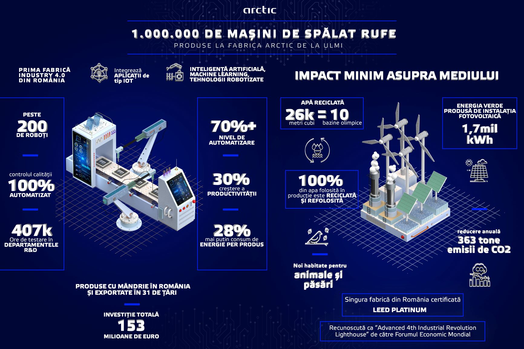 Inaugurată la finele anului 2019, în urma unei investiții totale de 153 de milioane de euro, fabrica Arctic de la Ulmi integrează cele mai recente tehnologii de machine learning și procese de automatizare, ce permit angajaților să lucreze cot la cot cu roboții, generând o creștere a productivității cu până la 30%.