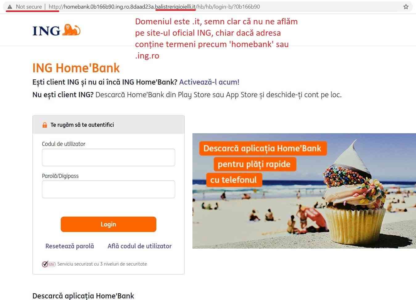 În cazul în care destinatarul mesajului accesează link-ul anexat butonului ‘Intră în Home Bank’, este direcționat către un site care face phishing. Din nou, la o simplă verificare a adresei site-ului se poate observa că utilizatorul NU este pe site-ul oficial al băncii, ci pe un domeniu .it, dar mulți nu își dau seama.