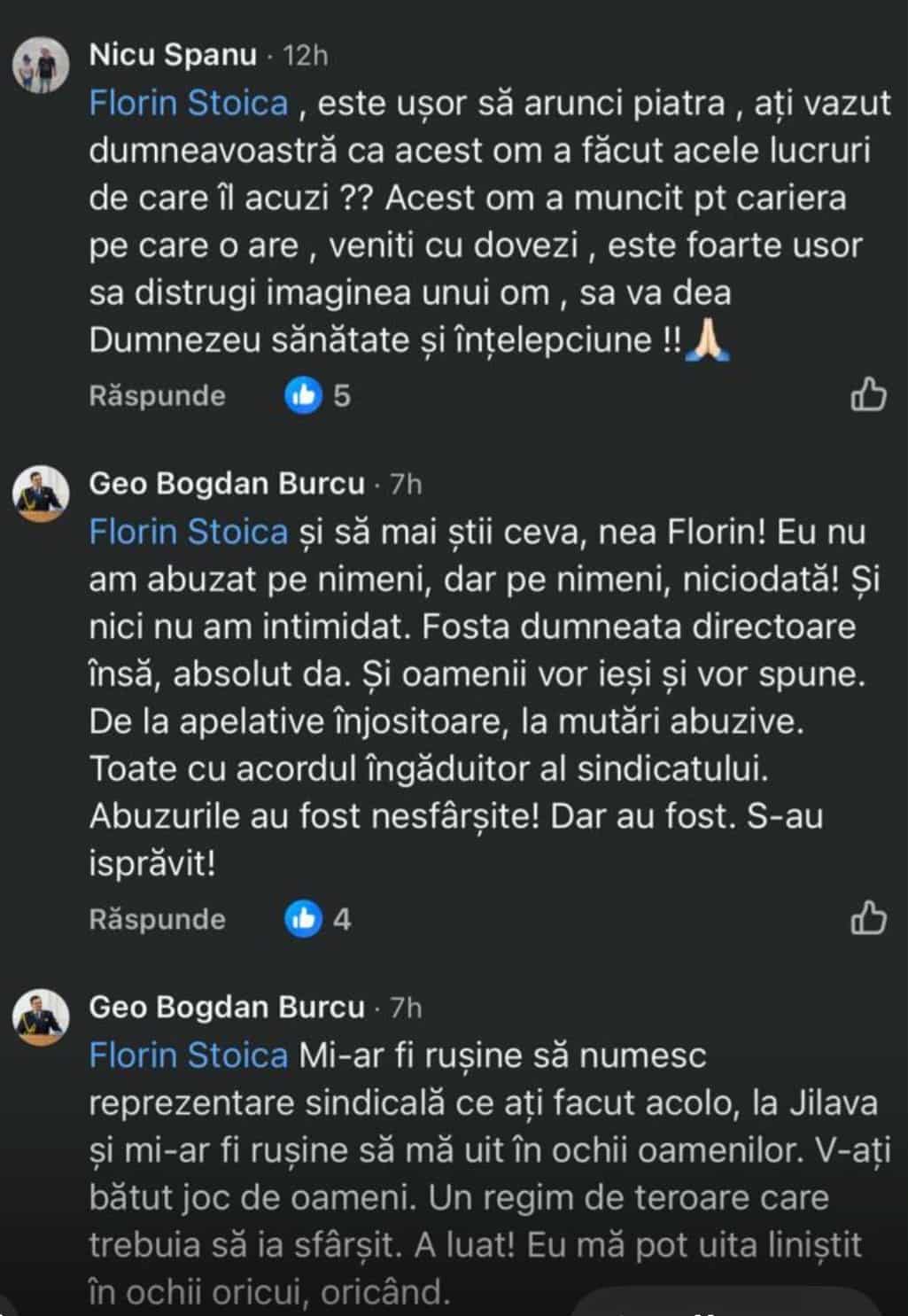 Geo Bogdan Burcu: „Florin Stoica și să mai știi ceva, nea Florin! Eu nu am abuzat pe nimeni, dar pe nimeni, niciodată! Și nici nu am intimidat. Fosta dumneata directoare însă, absolut da. Și oamenii vor ieși și vor spune. De la apelative înjositoare, la mutări abuzive. Toate cu acordul îngăduitor al sindicatului. Abuzurile au fost nesfârșite! Dar au fost. S-au isprăvit!”