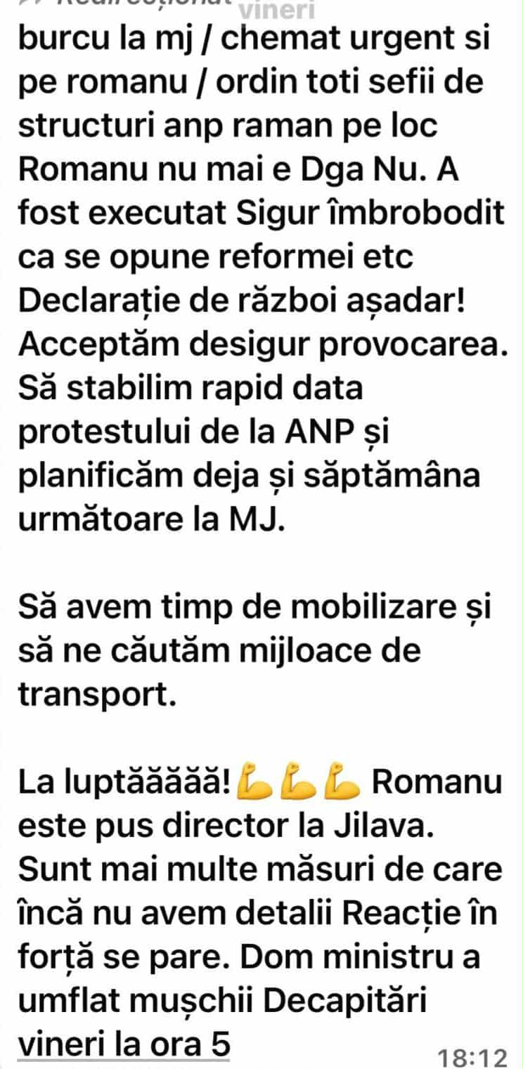 Între timp, pe grupurile de WhatsApp ale Sindicatului Național al Polițiștilor de Penitenciare (SNPP), condus cu o mână de fier de Ștefan Teoroc, soțul „Baroanei”, se dezlănțuie iadul. Mesaje apocaliptice anunță războiul: „Ministrul Justiției și directorul general ne declară război!”. Tonul este unul isteric, demn de o telenovelă turcească, cu amenințări voalate și acuzații grave. Se pare că „familia” se simte atacată direct, iar războiul personal s-a transformat într-un linșaj public, cu jigniri, insulte și calomnii la adresa directorului general Burcu.